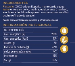 Deliciosa combinación de pistacho y chocolate, sin azúcar añadido.